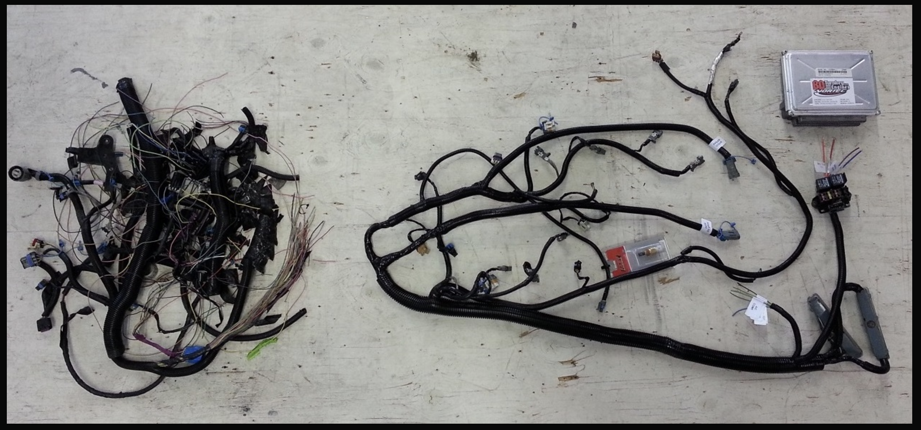 As part of their overall engine package, BD Turnkey rewires the OEM harness so that “your harness will be simplified down to four wires to make it start and run, and all unneeded plugs will be removed.” The simplified harness includes an OBDII connector for scanning and programing.